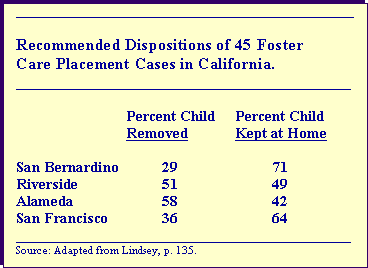 In 1980, Donnelly examined foster care placement decisions by asking experienced caseworkers in four California counties to make recommendations on fifteen hypothetical cases. The decision to remove a child from the home varied substantially between the caseworkers. Those in Riverside and Alameda counties were more likely to remove a child than were their counterparts in San Bernadino and San Francisco counties, despite the geographic proximities.[15]